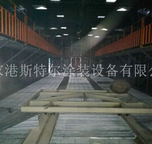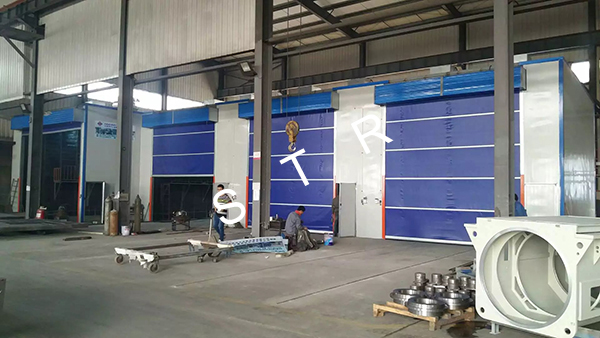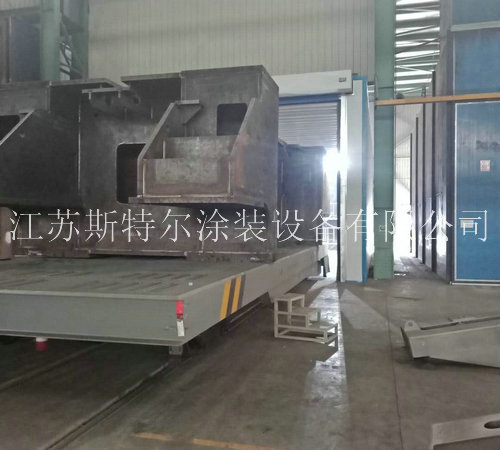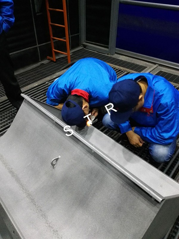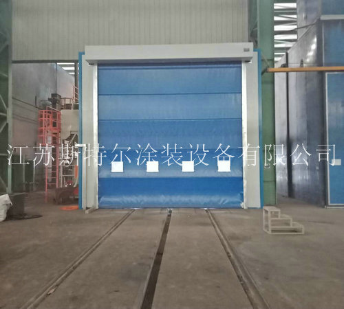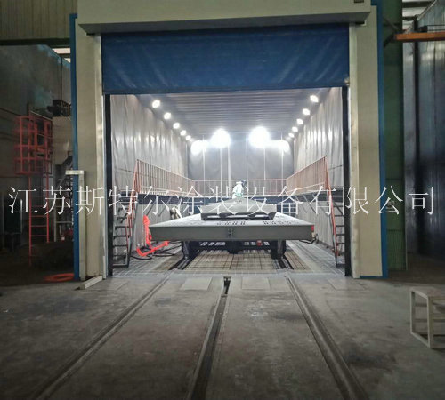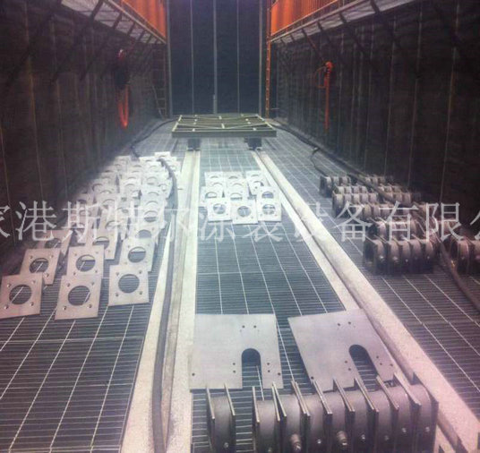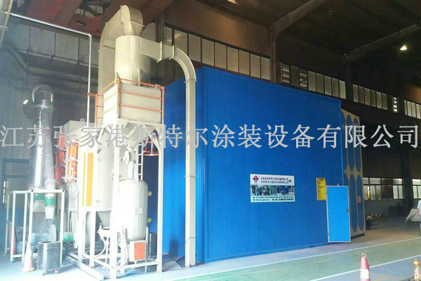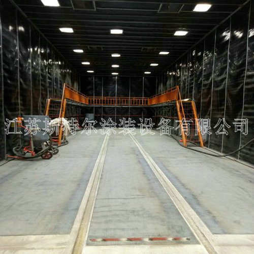 根據客戶要求及工件尺寸,房體工作尺寸設計為18x6x6.5m。本噴砂房體通過100mm方管做基本的三層架構,里面的人員通過50方管做里面的人員維持,里面的人員鋪2mm鋁合金板及3mm再生膠板,室外壁墻通過50mm厚彩剛夾心板開發,看上去整齊、配置高效、抗腐蝕抗造。彩鋁合金板夾心層為聚苯丁二烯發泡橡膠,與通常用純鋁合金板制做的