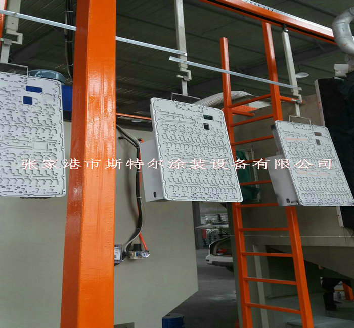 江蘇某企業在我司定制的懸掛鏈自動噴砂機具有以下幾個特點貨品(pin):主(zhu)要是(shi)華為集團5G 基站(zhan)天(tian)線鋁殼板。