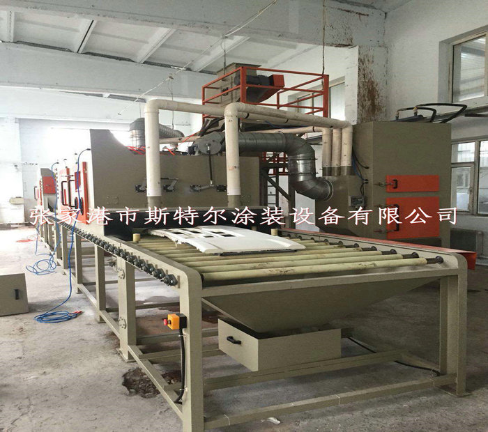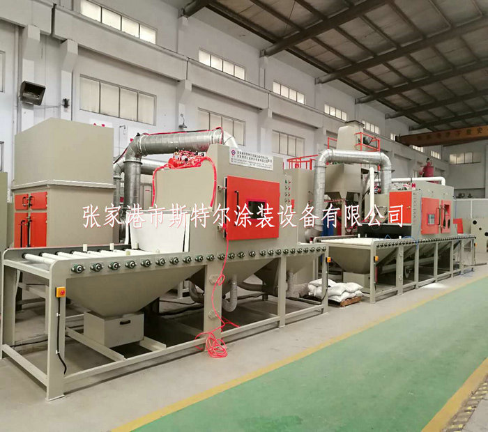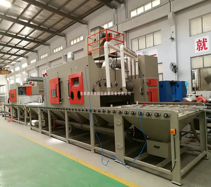 工人只操作噴砂機的控制系統和裝卸工件(或由上下工序的噴砂機的輸送機構輸入或者輸出),需要噴砂的工件放置在噴砂機的輸送機構上會自動運行經過吹氣倉后在通過噴砂工作倉進行表面噴砂處理,表面達到一定的粗糙度及達到除油,除污垢的最終效果,噴砂機加工結束后在經過除塵倉及吹氣倉,最終經過噴砂機的輸送機構運送出來。即噴砂加工結束。經過人工識別檢測后搬離,如工件上面有殘留的砂粒及粉塵時由人工使用吹氣槍清理結束后搬離。一般在噴砂機的一端出口會設計吹氣風刀,達到粉塵及砂料95%以上清除干凈。但是有可能殘留在死角及內孔里的砂料,在這種情況下只有靠人工清理,才可以全部清理結束。 生產加工依次下列: